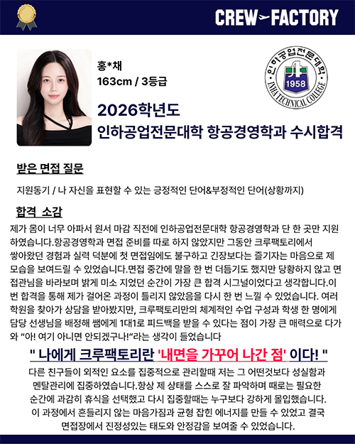 제가 다니는 고등학교 언니들 모두 인하공전 항공운항과 합격했고 다 크루팩토리 로리쌤 제자들이라 안가면 안 되는 학원이라 생각했어요..