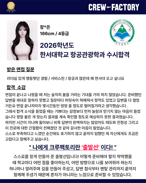 승무원 학원을 알아보면서 저는 총 다섯 군데나..! 상담을 다녔었습니다. 다섯 군데에 다녀본 저의 최종 결론은 '크루팩토리 로리쌤 못따라간다...' 였어요! 어느 학원보다도 입시에 대한 정보나, 자신감이 엄청나다는 것을 느꼈고 체계적인 부분 역시도 남달랐어요! '이런 학원에서 입시를 준비한다면 무조건 잘 갈 수 밖에 없겠구나' 라고 생각했어요!