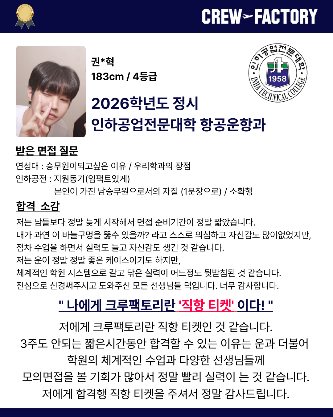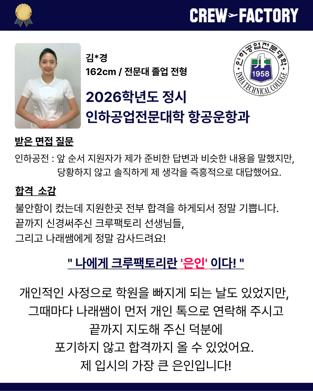 제가 다니는 고등학교 언니들 모두 인하공전 항공운항과 합격했고 다 크루팩토리 로리쌤 제자들이라 안가면 안 되는 학원이라 생각했어요..