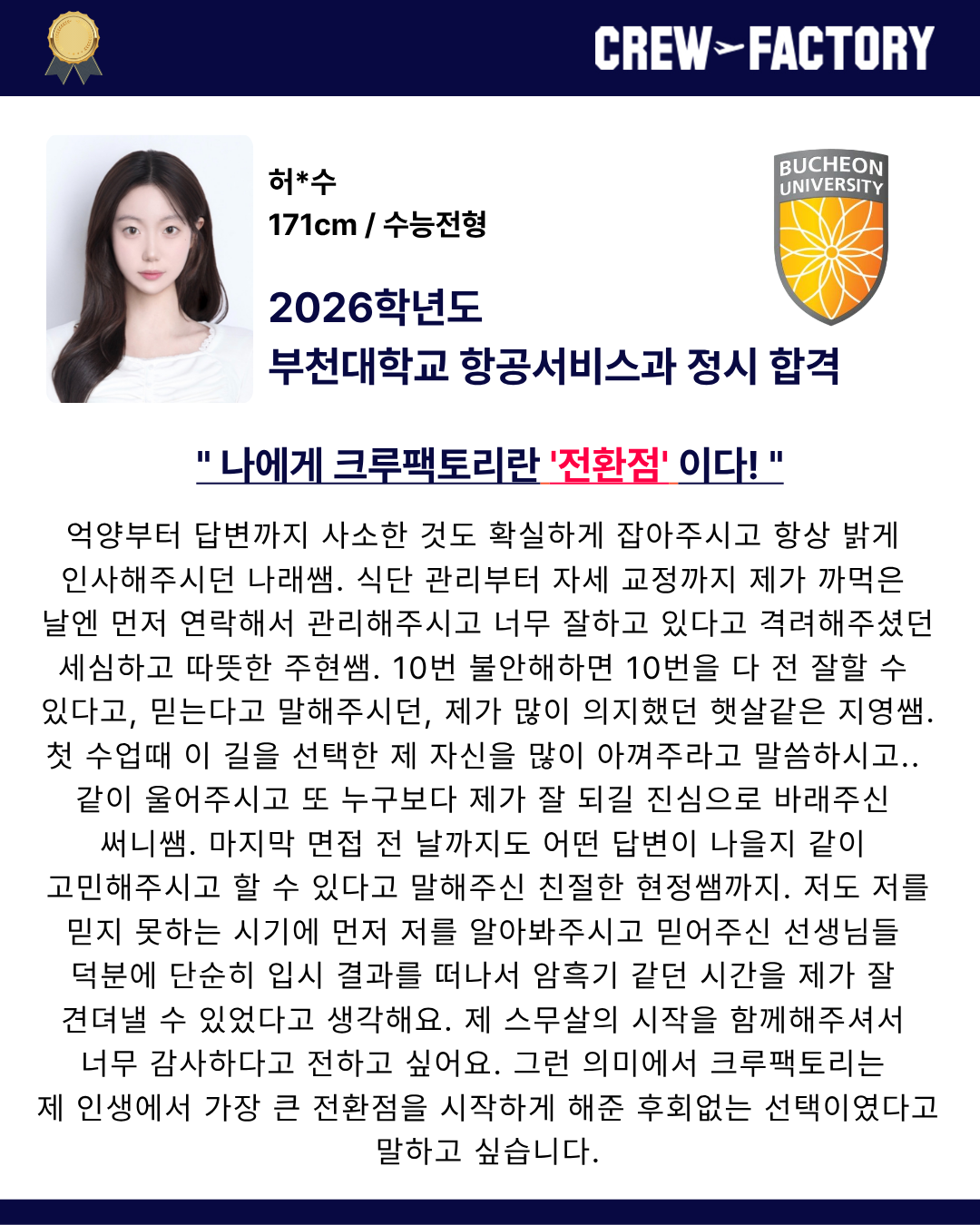 다른 학원에서는 저에 대한 장점만 말해 주셨는데 크루팩토리 로리쌤은 자세부터 표정, 행동 등 다양하게 피드백을 해주셨으며 다이어트가 필수였던 저에게 몸무게 숫자까지 정해주시는 등 구체적으로 고쳐야 할 점들을 잘 알려주셨습니다. 이렇게 자세하고 저에 대해 관리를 잘 해주실 거라는 확신이 들어 부모님과 상의 끝에 고등학교 2학년 1월부터 크루팩토리와 함께 하게 되었습니다. 항상 감사해요!