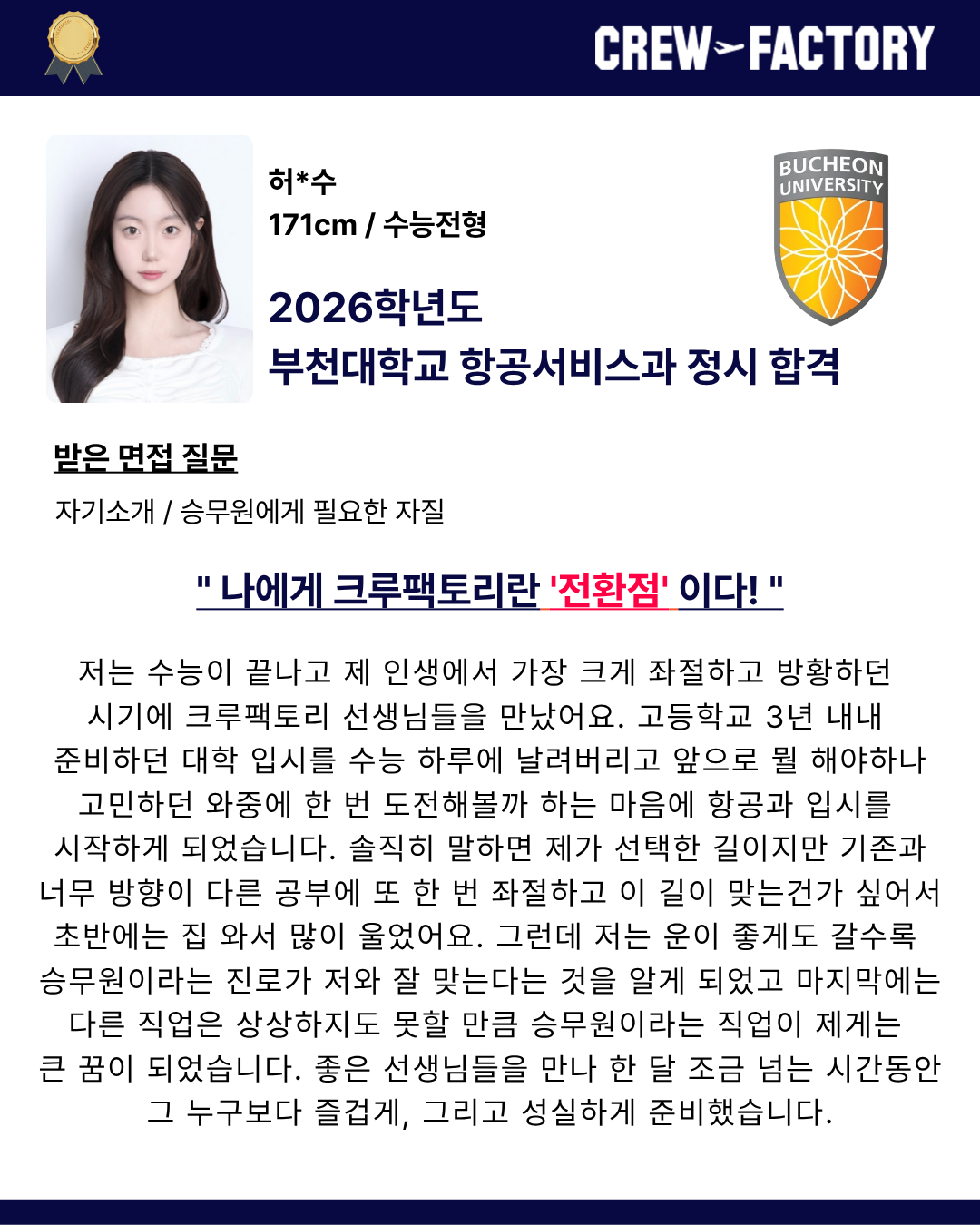 그동안 승무원이라는 직업에 자세히 알아보지도 않았고 여러 면에서 부족했던 저에게 단호하게 피드백 해주시고 희망을 주신 덕분에 많은 도움이 되었던 상담 이였습니당! 친절하게 자세히 설명해주신 크루팩토리 로리선생님께 감사하다는 말을 전해드리고 싶어요! 감사합니당. :)♥